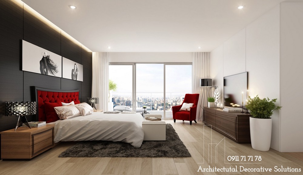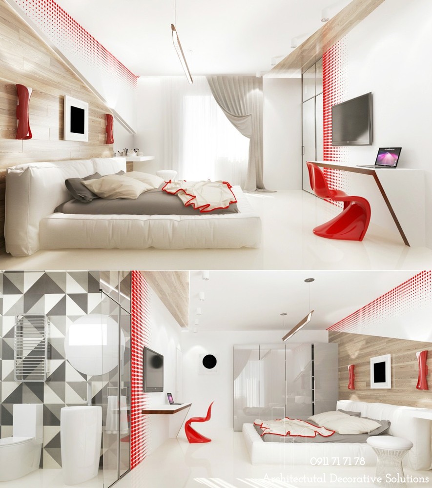Việc pha trộn màu đỏ thật khéo léo và thông minh tạo thành những tia lửa trẻ trung vừa tiết chế màu trắng tràn ngập không gian, vừa tiết chế cảm xúc đủ cho ai may mắn sở hữu không gian tuyệt vời này.