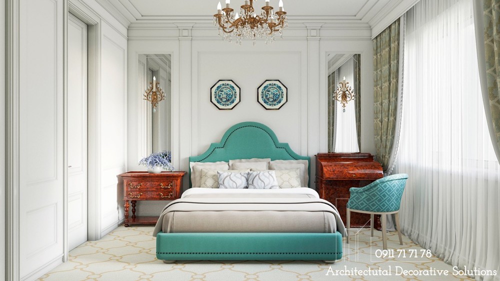 Một chiếc giường màu ngọc lam và ghế phụ cho phòng ngủ Victoria lấy cảm hứng từ một twist hiện đại.