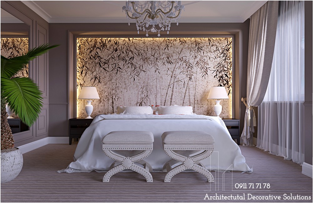 Một phòng ngủ với đèn chùm đi cùng bộ với 2 đèn ngủ đầu giường ngủ mang đến sự mỏng manh nhưng thanh thoát.