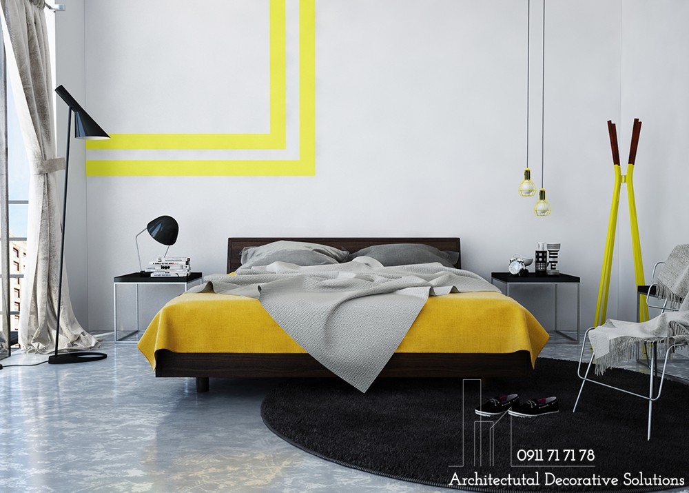 Trong cảm hứng với màu vàng, ga trải giường cùng một bức tường đề can sáng tạo, cây treo quần áo mang đến vẻ đẹp ngọt ngào và sâu sắc cho phòng ngủ.