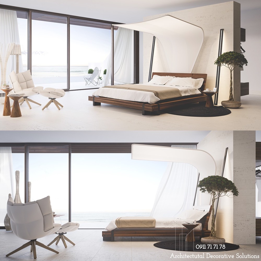 Đầu giường được cách điệu kiểu mái che cho phòng ngủ này một cảm giác như đang bên bờ biển. Cho phép chủ nhân vi vu cùng những giấc mơ ra biển xanh.