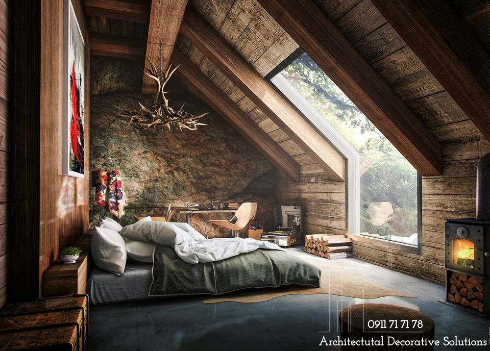 Một phòng ngủ trên tầng áp mái với khung cửa kính kéo dài lên giữa mái nhà. Không gian được bao phủ bởi gỗ thô mộc đơn giản cùng đá rêu phong. Bạn giống như đang được đắm mình giữa thiên nhiên, được ôm ấp, che chở và ru giấc ngủ ngon.