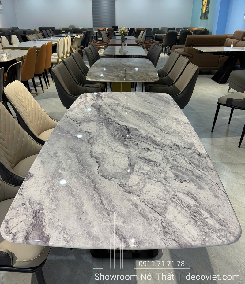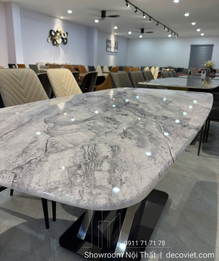 Mặt bàn được sử dụng chất liệu đá cẩm thạch tự nhiên xám trắng, mang vẻ đẹp tinh tế, thanh lịch và dễ dàng phối hợp với nhiều phong cách nội thất từ hiện đại, tân cổ điển đến luxury. Mang đến độ bền vượt trội, chống thấm ố và chịu nhiệt tốt – cực kỳ phù hợp với không gian ăn uống thường xuyên sử dụng.