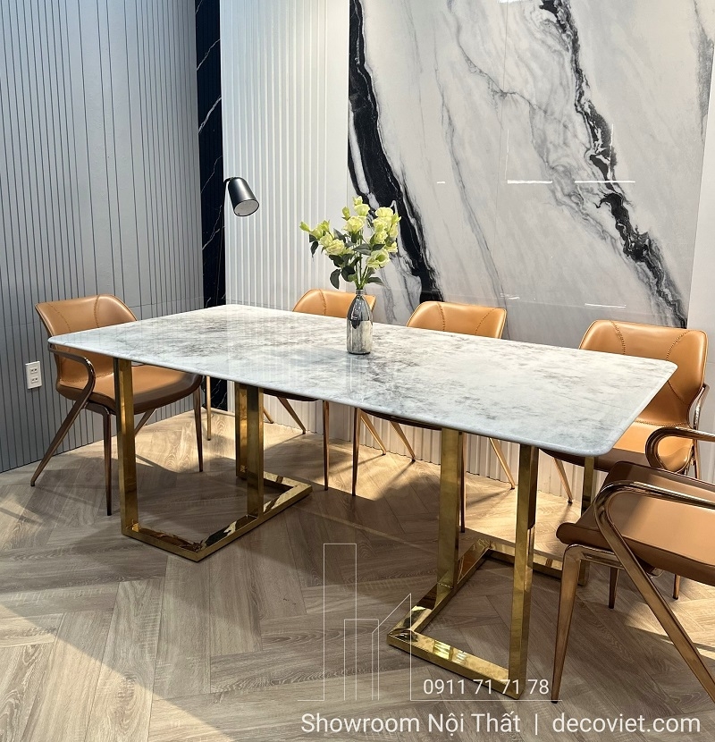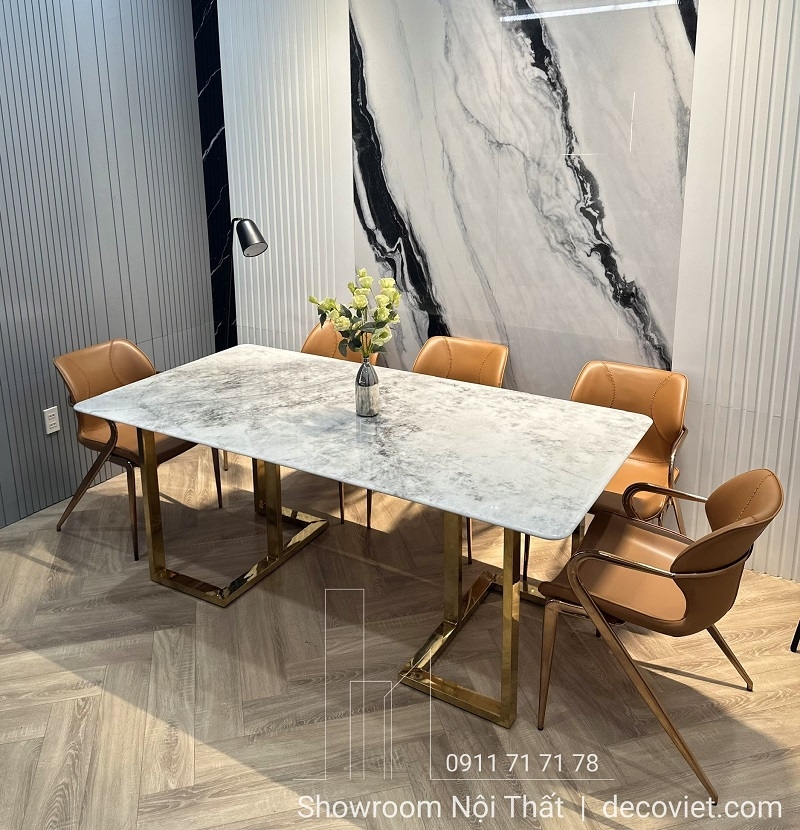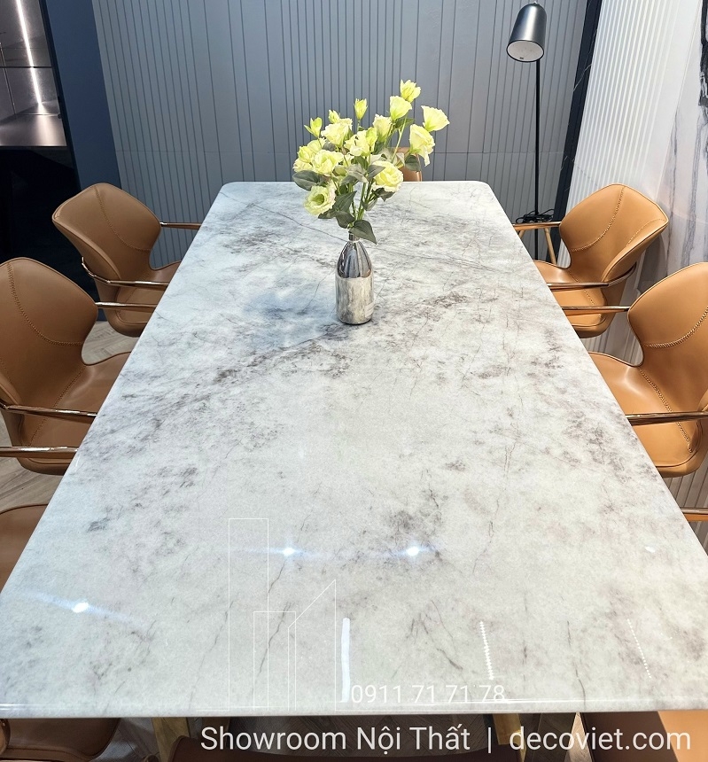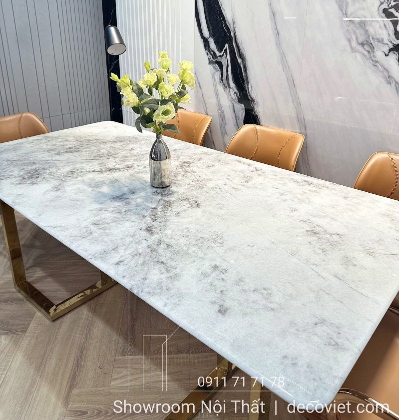 Mặt bàn được chế tác từ đá cẩm thạch tự nhiên với đường vân ấn tượng, không trùng lặp.
