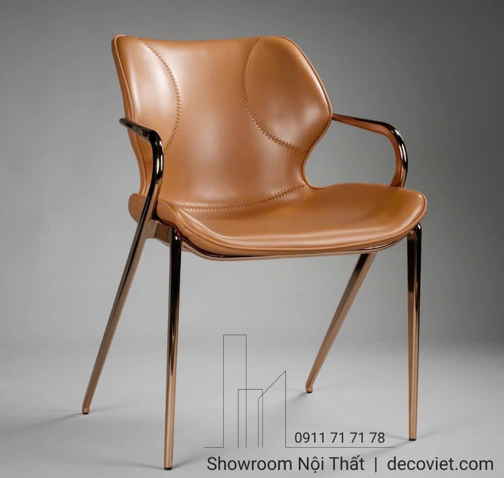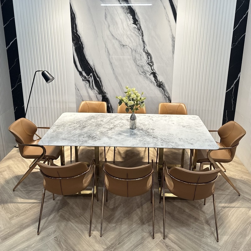 Ghế ăn đi kèm được bọc da chống trầy cao cấp, chân inox vàng hồng cùng style giúp nâng tầm cả bộ bàn ăn.