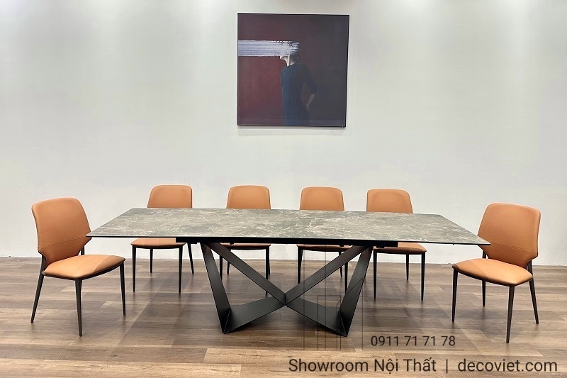 Chân bàn sắt thiết kế độc đáo ấn tượng, sử dụng công nghệ sơn tĩnh điện, chống hoen gỉ, hạn chế sự ăn mòn hoặc các tác nhân bên ngoài, gia tăng tuổi thọ cho sản phẩm. Kết hợp ghế ăn bọc da hiện đại, càng làm cho bộ bàn ăn thêm cuốn hút.