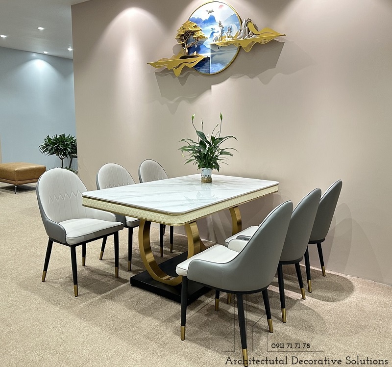 Là một trong những mẫu bàn ăn đẹp được yêu thích nhất tại DecoViet, Bàn Ăn Mặt Đá dễ dàng kết hợp hài hòa với các món đồ nội thất trong phòng như thảm trải sàn, ghế ăn, tủ trang trí. Ngoài ra, dáng bàn ăn này còn có thể kết hợp với mặt bàn đá giúp không gian thêm sang trọng và tinh tế hơn.
