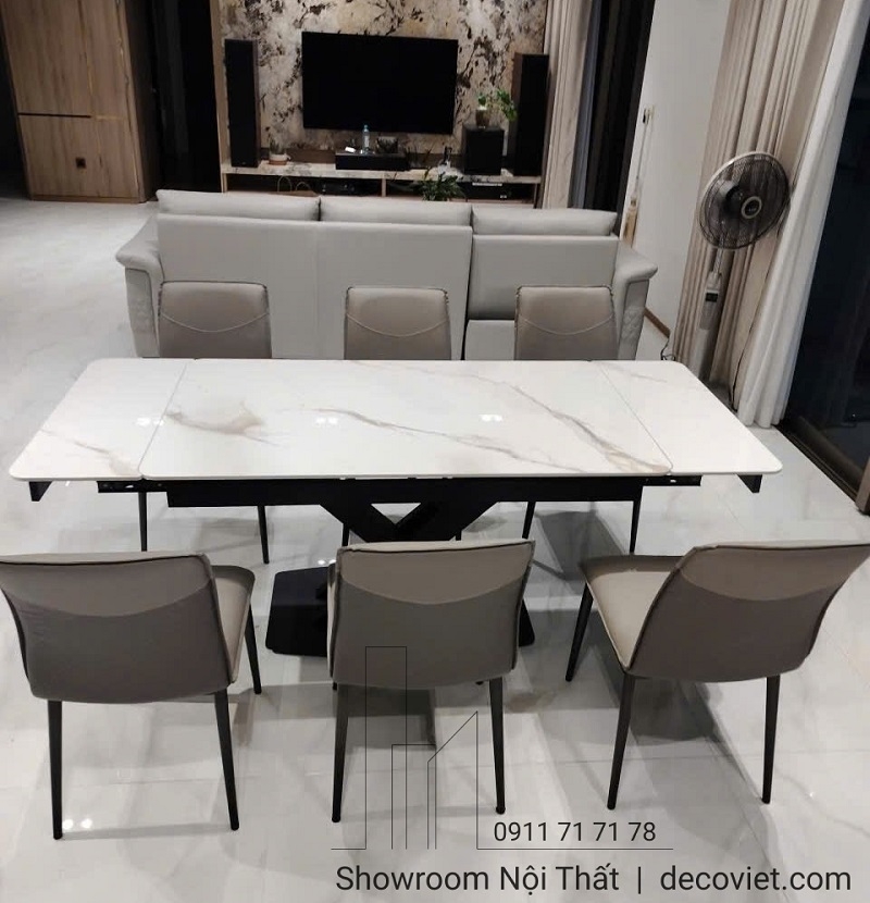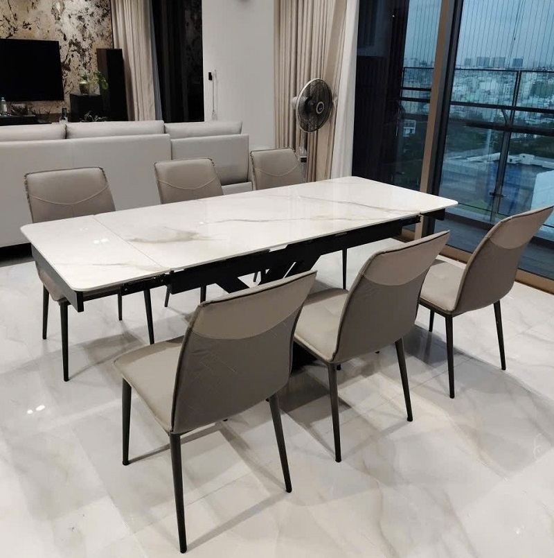 Bàn Ăn Thông Minh Kéo Dài 2m Giá Rẻ 2721S sở hữu mặt bàn bằng đá ceramic cao cấp – chất liệu nổi bật nhờ độ cứng vượt trội, khả năng chống thấm ố và dễ dàng vệ sinh. Vân đá trắng vân tự nhiên kết hợp cùng tông màu hiện đại mang đến vẻ đẹp thanh lịch, góp phần làm bừng sáng không gian phòng ăn và nâng tầm phong cách sống của gia đình bạn.