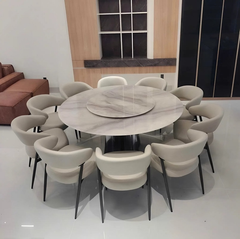 Với đường kính 1m6, mẫu Bàn Ăn Tròn 1m6 10 Ghế Cao Cấp 2896S mang lại không gian sử dụng thoải mái, cân đối hoàn hảo cho phòng ăn lớn, nhà phố cao cấp hoặc biệt thự. Bàn ăn sử dụng chân inox trụ trung tâm độc đáo, chắc chắn nhưng vẫn gọn gàng, giúp phần dưới bàn thông thoáng, không rối mắt. Đặc biệt, mặt đá cẩm thạch kết hợp mâm xoay tăng tiện ích khi dùng bữa: ai cũng dễ gắp món, phù hợp cho gia đình đông người và những buổi tiếp khách sang trọng.