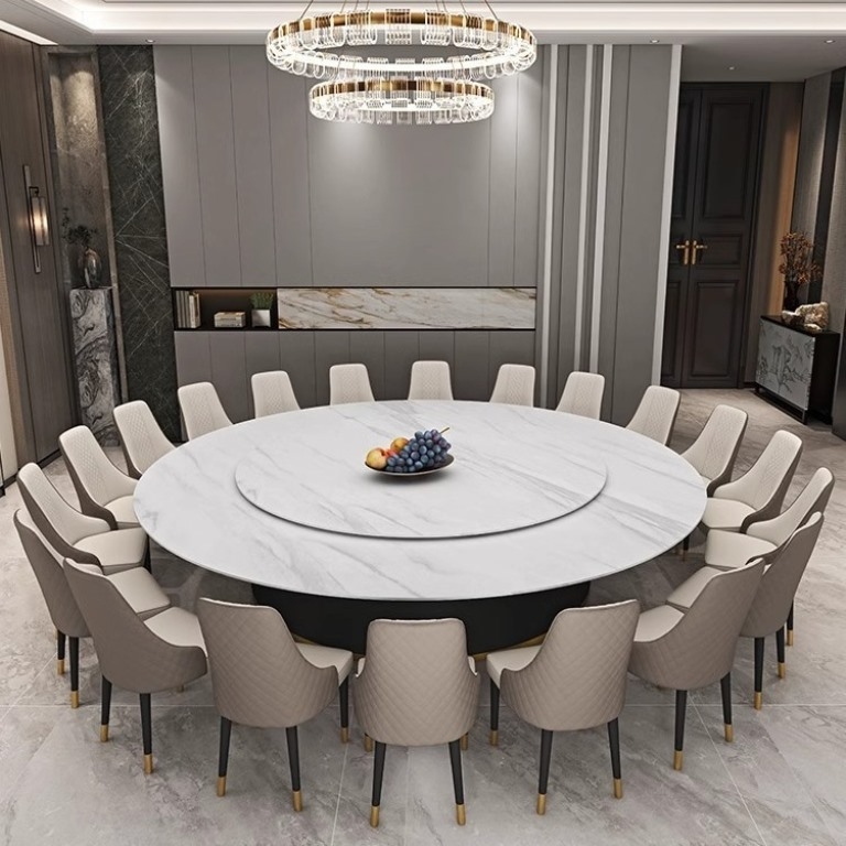 Mặt đá cao cấp sáng bóng, dễ dàng vệ sinh, mang đến không gian ăn uống luôn sạch sẽ và sang trọng. Bàn ăn tròn lớn 20 ghế với mâm xoay 360° tiện lợi giúp việc phục vụ trở nên thuận tiện, đồng thời tạo điểm nhấn tinh tế, nâng tầm vẻ đẹp và đẳng cấp cho toàn bộ không gian. Sự kết hợp hài hòa giữa mặt đá và chân trụ vững chắc thể hiện phong cách hiện đại, phù hợp cho cả phòng ăn gia đình lẫn nhà hàng cao cấp.