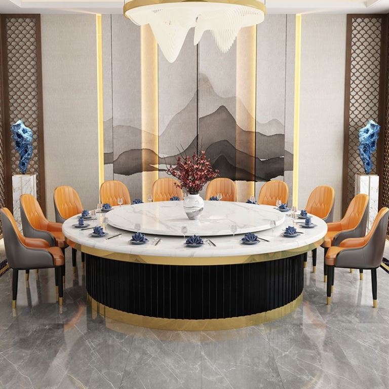 Bàn ăn xoay tròn 20 người là giải pháp hoàn hảo cho các không gian sang trọng như nhà hàng, khách sạn hay phòng hội nghị lớn. Với phong cách hiện đại và tinh tế, bàn mang đến điểm nhấn đẳng cấp cho mọi không gian. Mặt bàn đá cao cấp sáng bóng, kết hợp cùng chân gỗ chắc chắn tạo nên tổng thể bền vững và sang trọng. Bàn Ăn Tròn Mặt Đá 20 Ghế 2135S không chỉ đáp ứng nhu cầu sử dụng hằng ngày mà còn tôn vinh vẻ đẹp, nâng tầm thẩm mỹ cho không gian sống và tiếp khách.