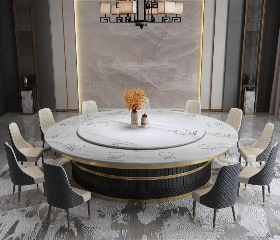 Bộ bàn ăn mặt đá xoay tròn 20 ghế được thiết kế dành riêng cho không gian sang trọng như biệt thự, nhà hàng hay phòng tiệc lớn. Mặt bàn đá sáng bóng cao cấp, dễ vệ sinh, hạn chế trầy xước, kết hợp cùng mâm xoay tròn tiện lợi giúp việc dùng bữa trở nên thuận tiện và tạo cảm giác gắn kết giữa các thành viên.