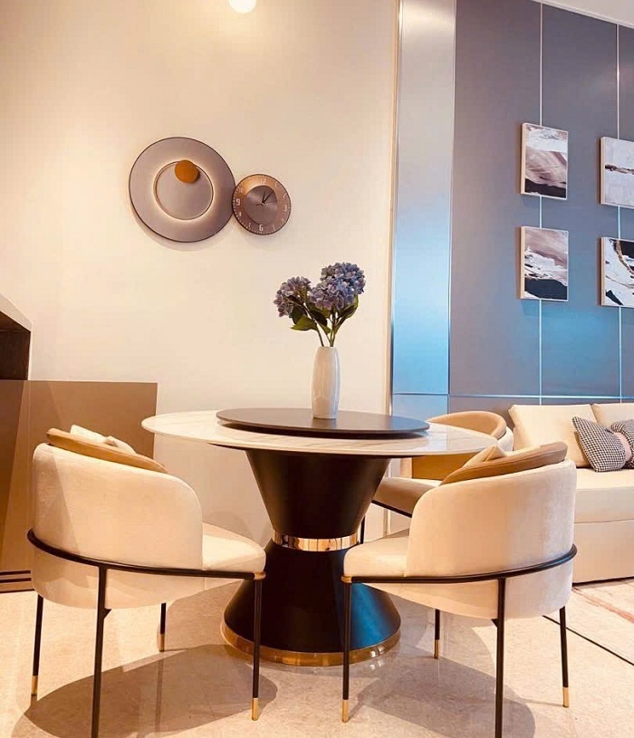 ▪ Thiết kế tròn gọn gàng: Diện tích mặt bàn 1.3m, đủ chỗ cho 4-6 người ngồi dùng bữa thoải mái, dễ dàng bố trí trong căn hộ chung cư