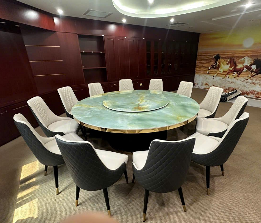 Bàn ăn tròn lớn, đặc biệt là loại Bàn Ăn Tròn Xoay 12 Người Cao Cấp 2528S, từ lâu đã trở thành biểu tượng của sự đẳng cấp và sang trọng trong không gian nội thất. Được chế tác tỉ mỉ từ các chất liệu cao cấp, bàn tròn to 12 ghế có khả năng thích ứng hoàn hảo với mọi không gian, từ những căn hộ cao cấp đến các nhà hàng sang trọng, mang đến sự hài hòa tuyệt vời giữa thẩm mỹ và chức năng. Mỗi chi tiết trên chiếc bàn ăn tròn mặt đá 12 ghế này đều phản ánh sự cầu kỳ và tinh tế trong thiết kế, từ mặt bàn mịn màng, sáng bóng cho đến chân bàn vững chãi, thể hiện gu thẩm mỹ và phong cách sống của gia chủ.