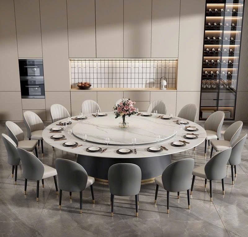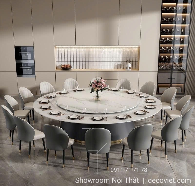 Bộ bàn ăn mặt đá tròn 20 ghế được thiết kế dành riêng cho không gian sang trọng như biệt thự, nhà hàng hay phòng tiệc lớn. Mặt bàn đá cao cấp, chống thấm, dễ vệ sinh, hạn chế trầy xước, kết hợp cùng mâm xoay tròn 360 độ tiện lợi giúp việc dùng bữa trở nên thuận tiện và tạo cảm giác gắn kết giữa các thành viên.