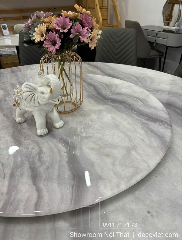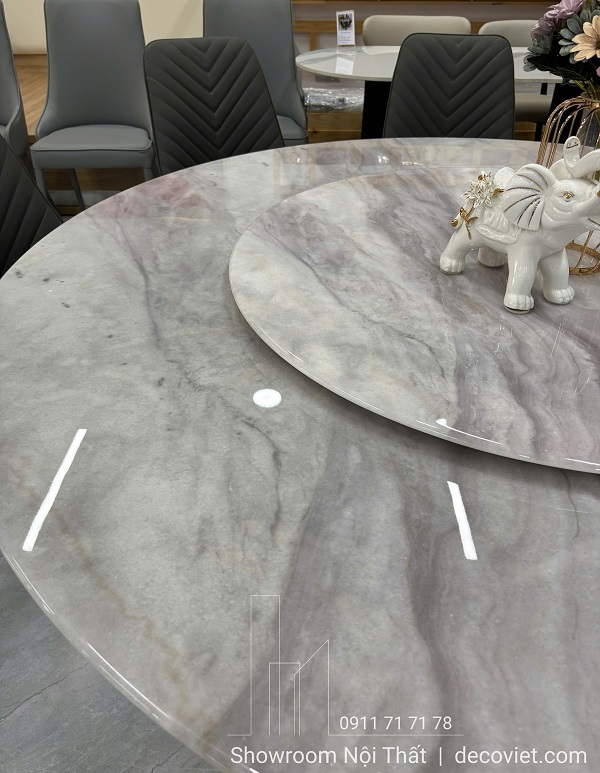 Điểm đặc trưng của Bàn Ăn Tròn Xoay Mặt Đá 2895S nằm ở phần mâm xoay trung tâm – chi tiết quen thuộc trong những phòng ăn sang trọng. Mâm xoay giúp việc dùng bữa trở nên tiện lợi hơn, đặc biệt với bàn 10 ghế, ai cũng dễ dàng gắp món mà không cần với tay. Mặt đá cẩm thạch sáng màu, vân loang nhẹ tạo cảm giác sạch sẽ, cao cấp và rất dễ vệ sinh trong quá trình sử dụng hằng ngày.