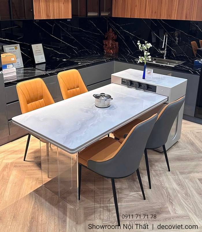 Bên cạnh đó, bếp từ âm được tích hợp ngay trên mặt bàn mang đến trải nghiệm nấu nướng – dùng bữa hoàn toàn mới. Nhờ thiết kế âm tinh gọn, bếp từ không chỉ tiết kiệm diện tích mà còn đảm bảo an toàn tuyệt đối trong quá trình sử dụng. Bạn có thể chế biến nhanh các món ăn nóng, hâm nóng thức ăn hoặc tổ chức những buổi ăn lẩu, nướng tại nhà mà không cần chuẩn bị thêm bếp rời cồng kềnh.