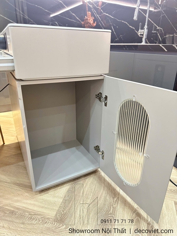 Các hộc kéo, ngăn tủ được trang bị rộng rãi, giúp bạn có thêm không gian để cất giữ những đồ dùng nhà bếp. Hệ thống đèn led chạy dọc theo cạnh bàn đảo bếp thông minh, giúp tạo ra một không gian nhà bếp sang trọng và lung linh hơn.