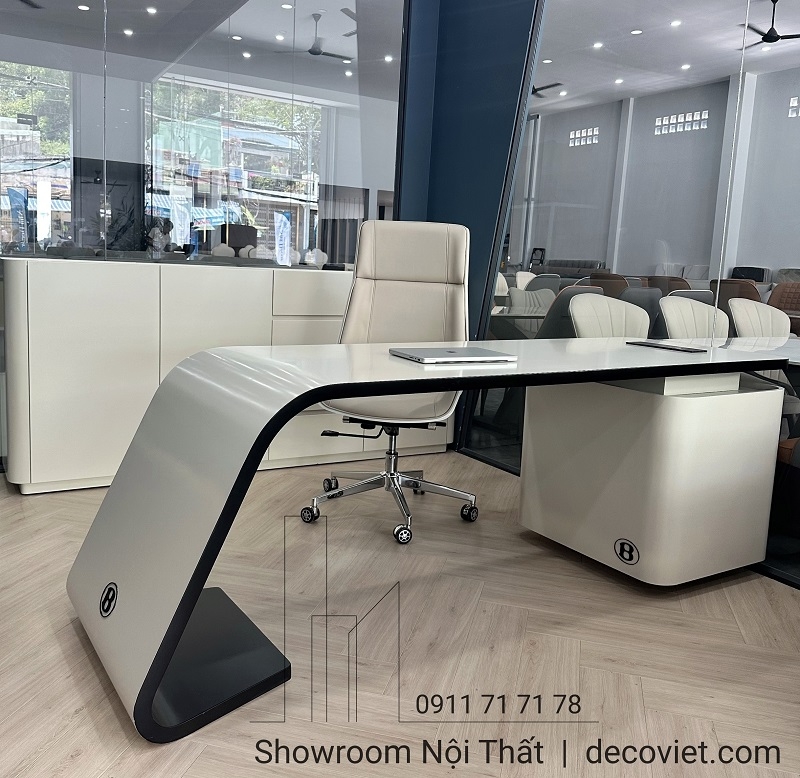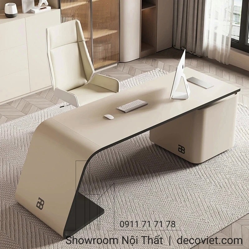 Sở hữu form dáng cong liền mạch theo phong cách “dòng chảy”, thiết kế này tạo cảm giác chuyển động mềm mại. Đồng thời, cấu trúc vẫn đảm bảo sự vững chắc cần có của một chiếc bàn làm việc đẹp mang tính biểu tượng trong phòng lãnh đạo. Cấu trúc chân mạnh mẽ kết hợp mặt bàn phẳng mịn giúp tổng thể trở nên nổi bật, sang trọng như một tác phẩm nghệ thuật trong phòng lãnh đạo.