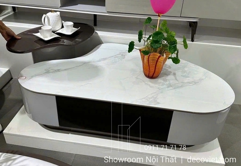 Mẫu bàn trà đẹp được thiết kế với kiểu dáng bo tròn mềm mại, cách điệu độc đáo tạo điểm nhấn cho phòng khách. Điểm nổi bật là mặt bàn đá vân mây cao cấp, bề mặt bóng mịn, chống thấm ố và dễ dàng vệ sinh. Bàn được tích hợp thêm bàn tab nhỏ, có thể linh hoạt trong việc sắp xếp và bày trí. Đây là giải pháp lý tưởng cho các gia đình muốn tận dụng tối đa diện tích mà vẫn giữ được sự gọn gàng, hiện đại.