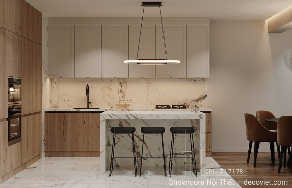Tủ bếp và các vật dụng khác nên được bố trí sao cho thuận tiện cho việc di chuyển và sử dụng. Hãy chú ý đến việc tạo ra một không gian lưu thông tốt, tránh tình trạng chật chội và bí bách.