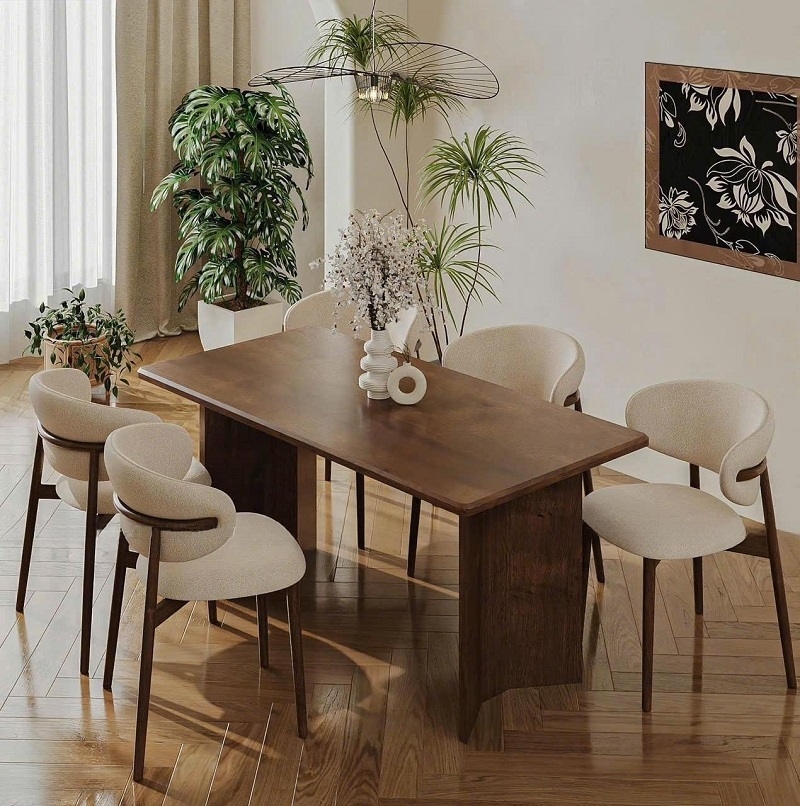 Dù là căn hộ chung cư, nhà phố hay homestay theo phong cách tự nhiên, bộ bàn ăn gỗ hiện đại dễ dàng hòa nhập và tạo điểm nhấn nổi bật. Không cần quá nhiều đồ trang trí, chỉ một bình hoa nhỏ, ánh đèn nhẹ và tông tường sáng là đủ để tôn lên vẻ đẹp trầm ấm, gần gũi của bộ bàn ăn này.