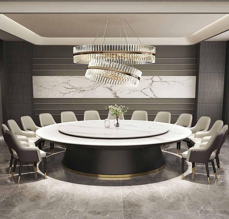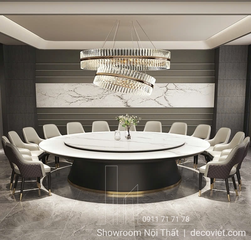 Bộ Bàn Ăn Tròn Lớn 20 Ghế 2142S là lựa chọn lý tưởng cho những không gian rộng như biệt thự, nhà hàng hay khách sạn cao cấp. Mặt đá sáng bóng kết hợp mâm xoay 360° giúp việc phục vụ trở nên dễ dàng và lịch thiệp. Chân bàn vững chãi cùng chi tiết viền vàng tinh tế tạo nên tổng thể vừa hiện đại vừa cuốn hút.