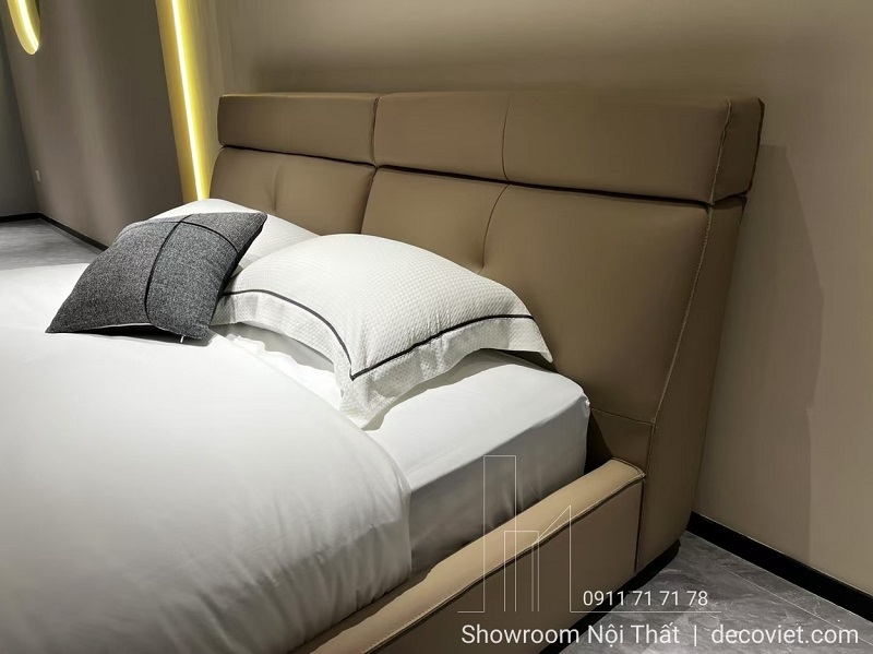 Tổng thể giường ngủ bọc da theo phong cách hiện đại tối giản, phù hợp với mọi không gian – từ căn hộ trẻ trung đến phòng ngủ biệt thự sang trọng. Bề mặt bọc da cao cấp mịn màng, không thấm bụi, dễ lau chùi, mang đến cảm giác sạch sẽ và bền màu theo thời gian.