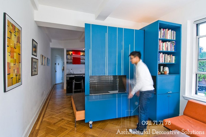 13. Bàn gấp hạ xuống khi không làm việc biến nó thành bức tường kim loại màu xanh phân cách không gian ấn tượng.