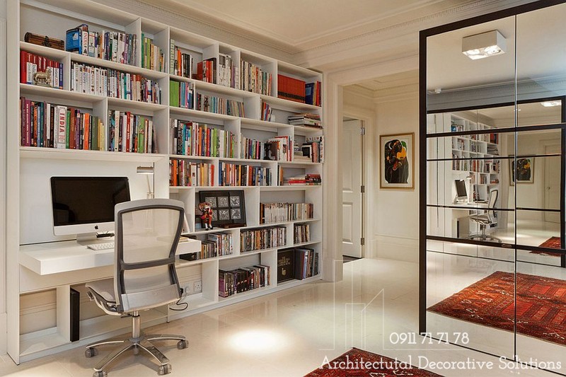 Văn phòng làm việc ngay tại nhà với không gian kệ rộng và bàn làm việc dạng gấp.