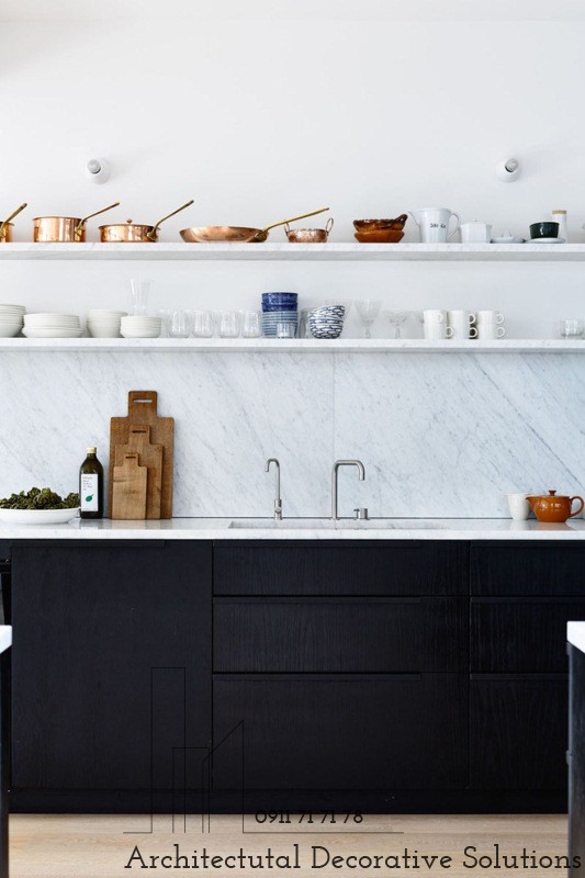 9. Sử dụng chất liệu đá cẩm thạch tự nhiên làm kệ mở bạn sẽ không còn phải lo ngại về vấn đề nhiệt độ hay việc bám bụi mang đến không gian bếp hiện đại có tính thẩm mỹ cao và độ bền cao của đá.