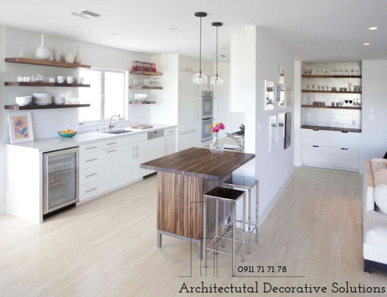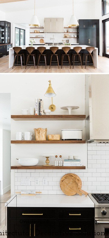 10. Những chiếc kệ mở gỗ chính là điểm nhấn bên trong phòng bếp hiện đại có thiết kế màu trắng đơn điệu này.