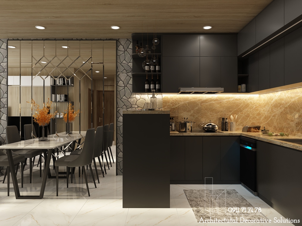 Bước chân bếp ăn đã mang đến một ấn tượng lớn, các kiến trúc sư đã sử dụng gỗ công nghiệp để làm nội thất căn phòng thêm nổi bật, hiện đại. Để tiết kiệm diện tích các kiến trúc sư đã thiết kế hệ thống tủ bếp đụng trần giúp gia chủ có thể cất giữ được nhiều đồ đạc hơn.