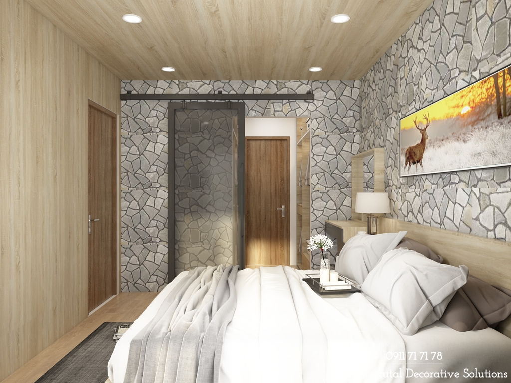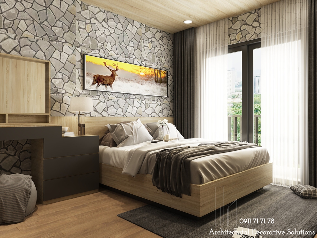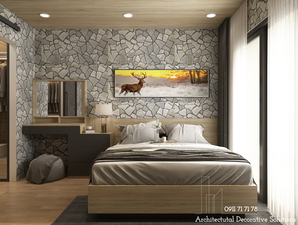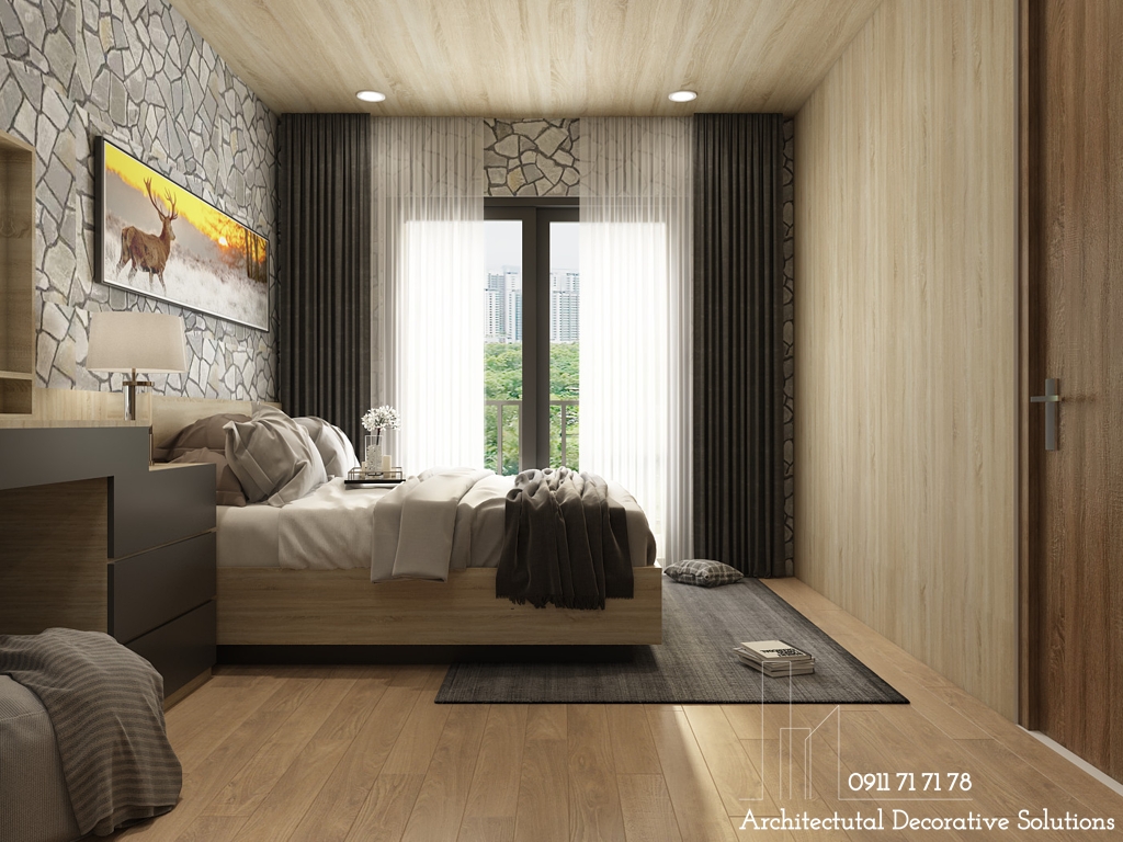 Căn phòng ngủ được thiết kế nội thất màu sắc sang trọng, gam màu trầm của gỗ mang lại sự ấm áp cho căn phòng. Với cách thiết kế này giúp tiết kiệm diện tích mà còn mang tới sự sang trọng và tinh tế cho phòng ngủ.