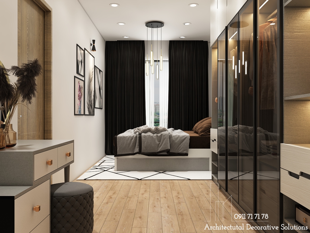 Mẫu nội thất phòng ngủ master đơn giản bao gồm giường ngủ đôi, tủ quần áo cạnh giường ngủ đối diện bàn trang điểm được sắp xếp hợp lý và khoa học.