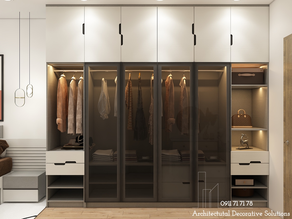 So với tủ áo gỗ truyền thống thì tủ quần áo cánh kính tạo điểm nhấn hơn cho căn phòng rất nhiều. Cánh kính tạo độ tương phản cả ánh đèn tạo không gian huyền bí, lãng mạn và hiệu ứng mở rộng hơn cho căn phòng.