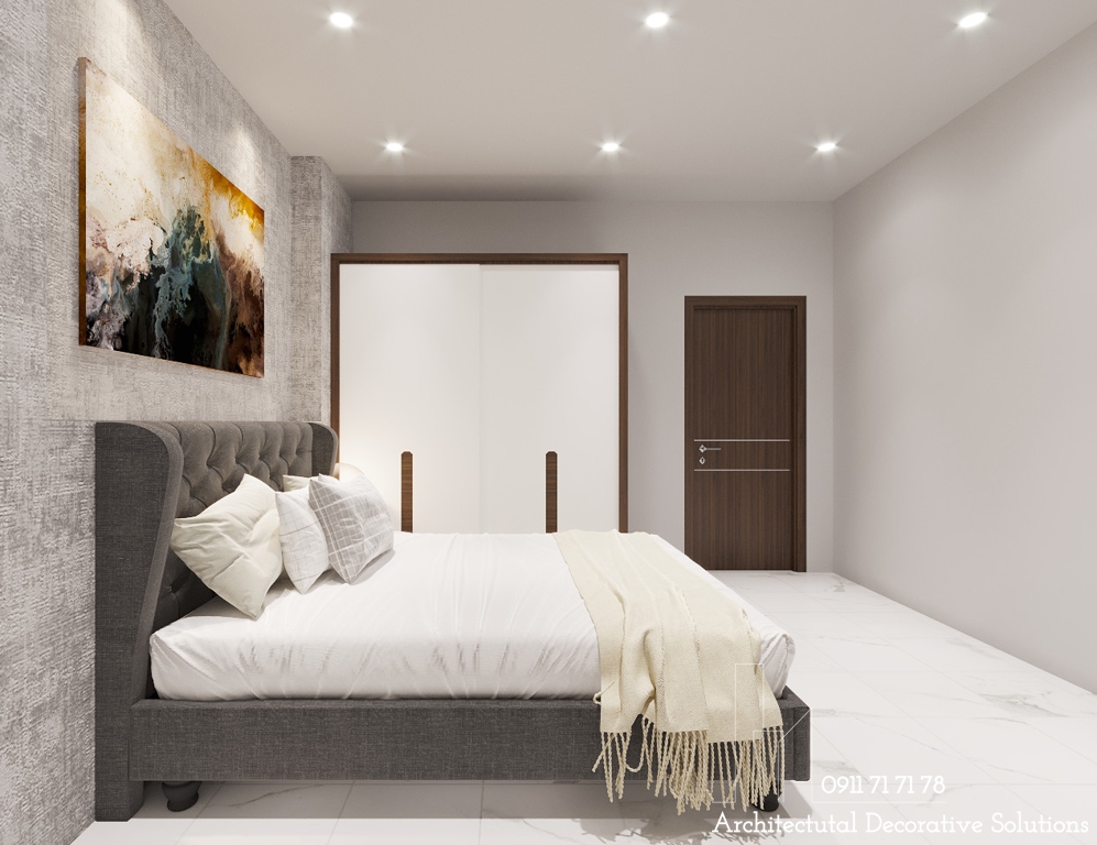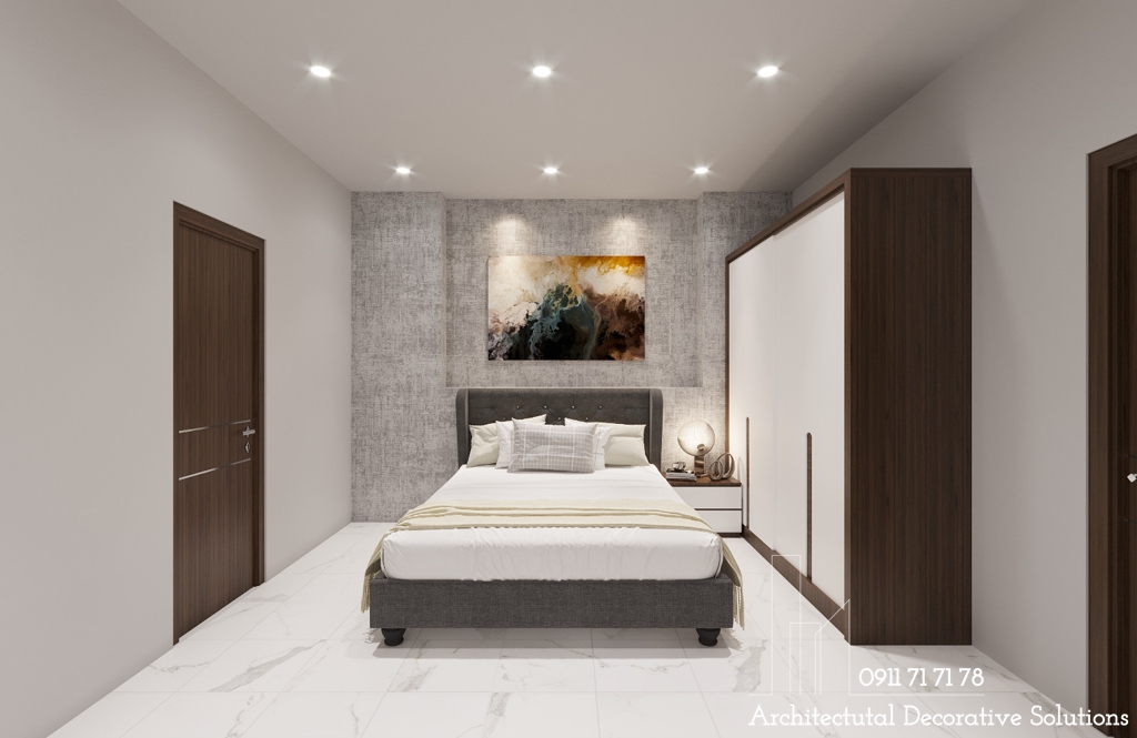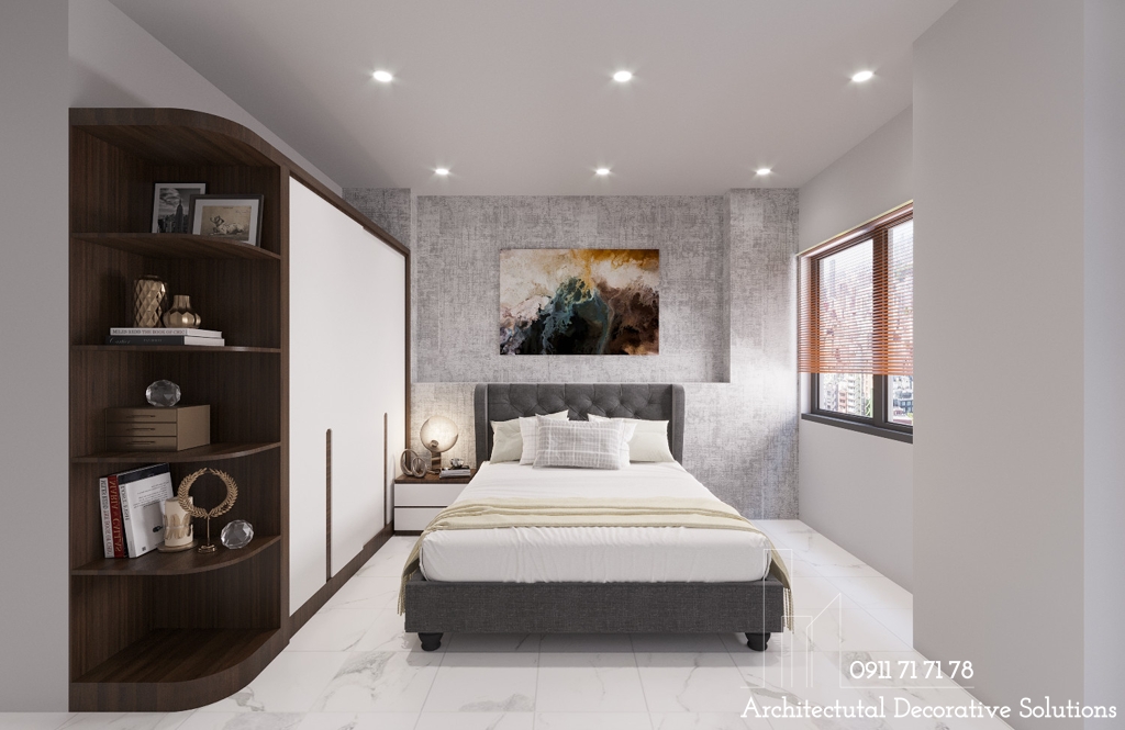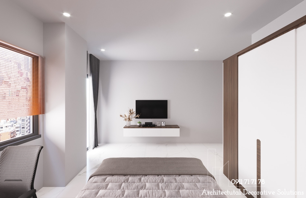 Mẫu nội thất phòng ngủ nhà phố này với phong cách đơn giản, gam màu trắng trang nhã với những mảng màu đen đan xen, tạo nên nét nổi bật cho thiết kế.